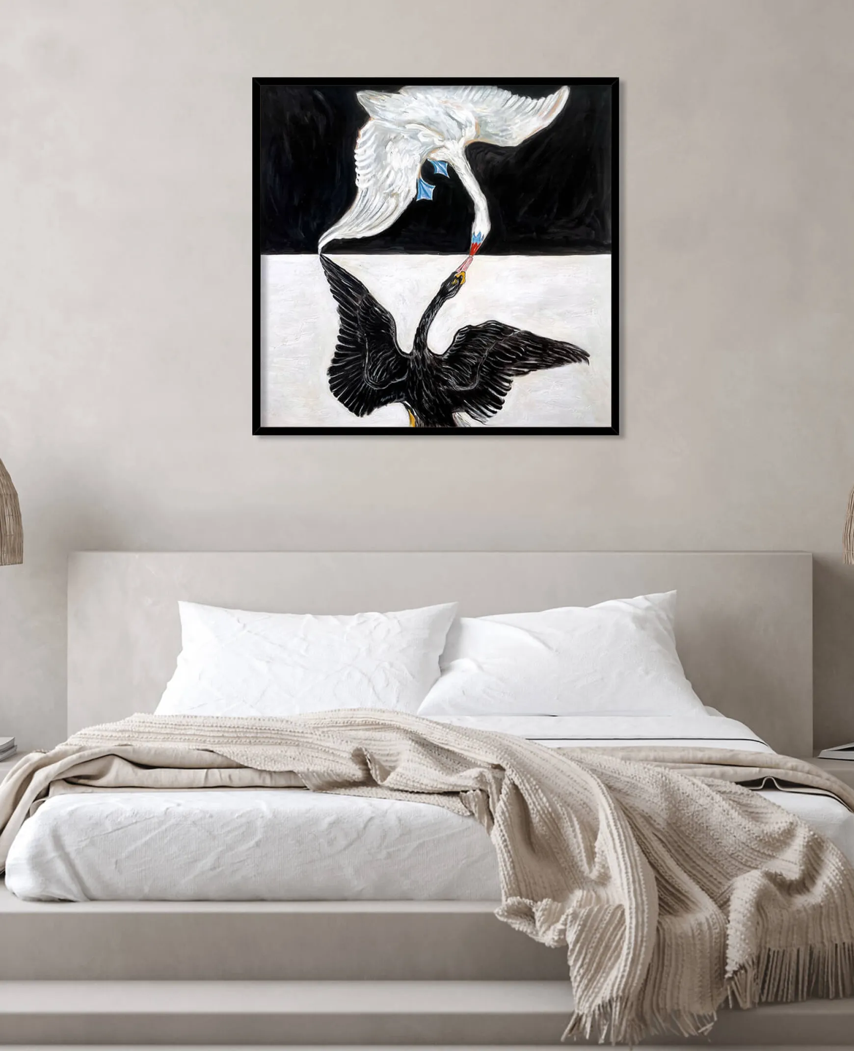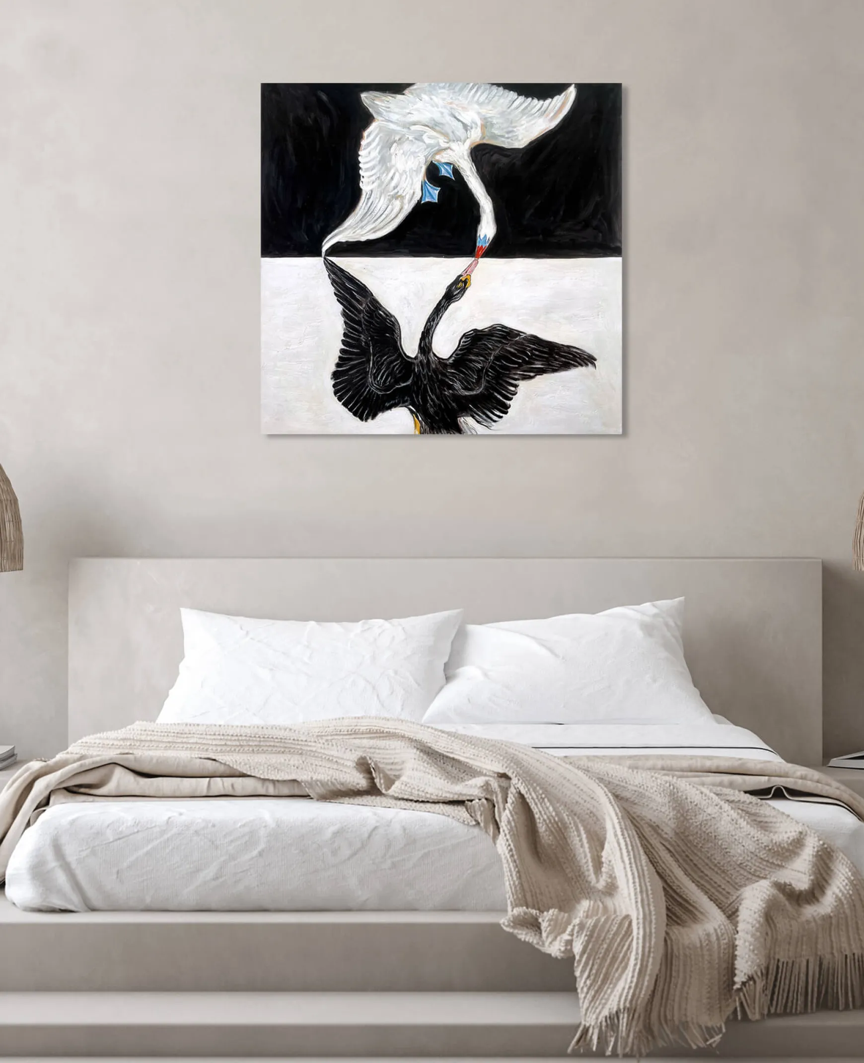 Les cygnes dans ce tableau de Hilma de Klint étant à la fois dualité et harmonie entre pureté et occultisme, attribuent leur couleur de sorte à ce que la féminité endosse la blancheur et la masculinité, la noirceur. Toutefois, deux types de lumières existent, en témoigne l’arrière-plan noir et blanc de la peinture. Celle du jour: solaire et mâle et celle de la nuit: lunaire et femelle.
