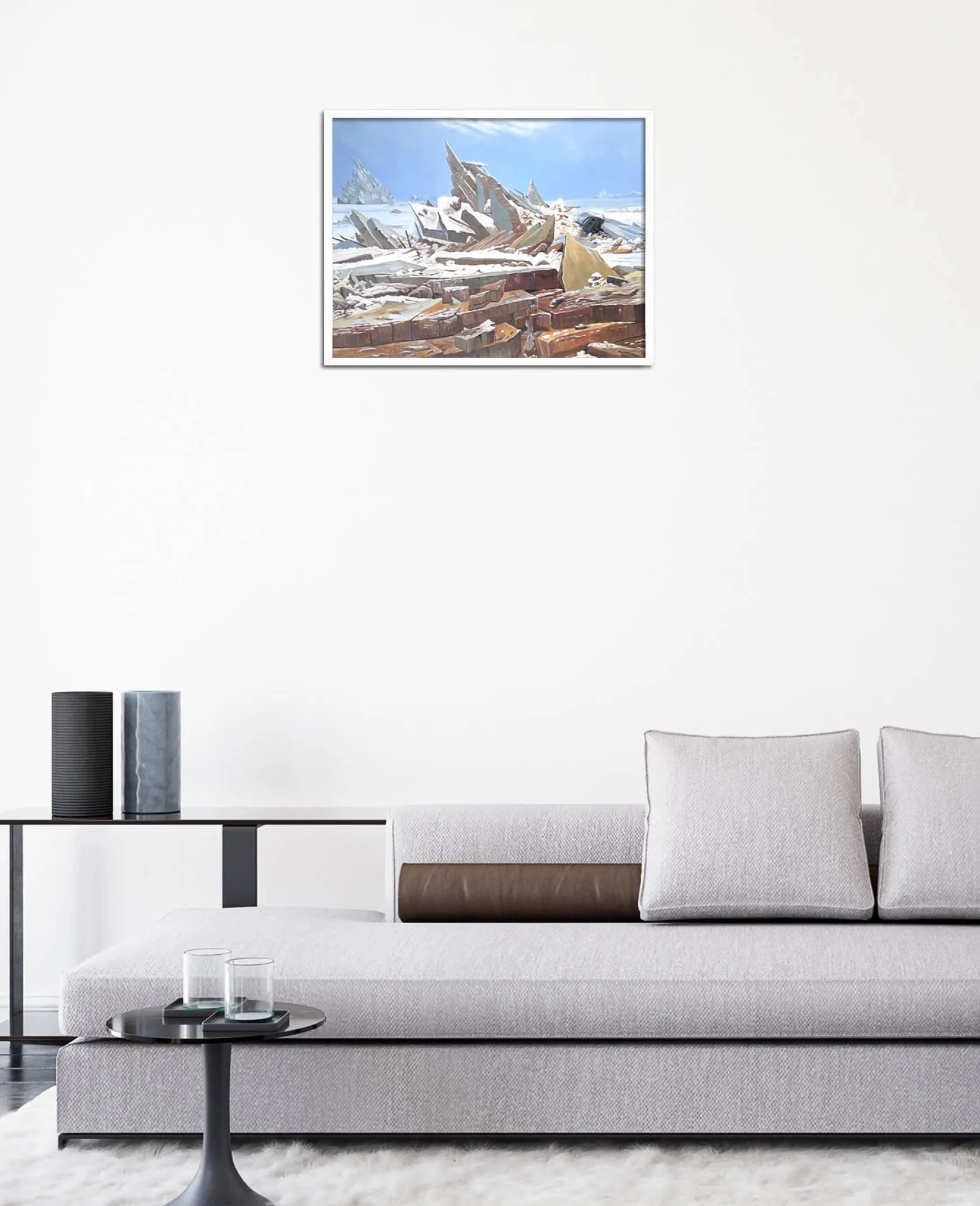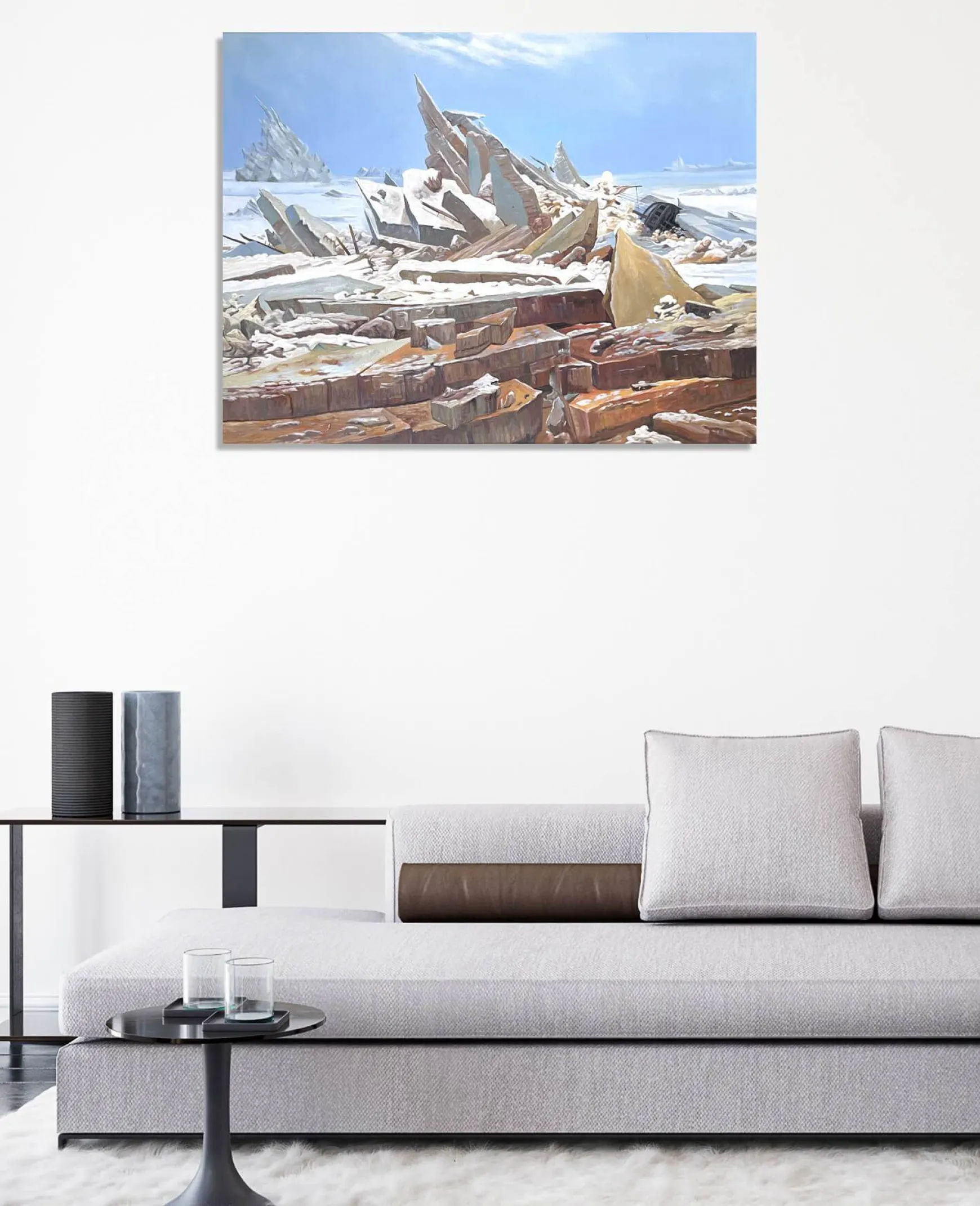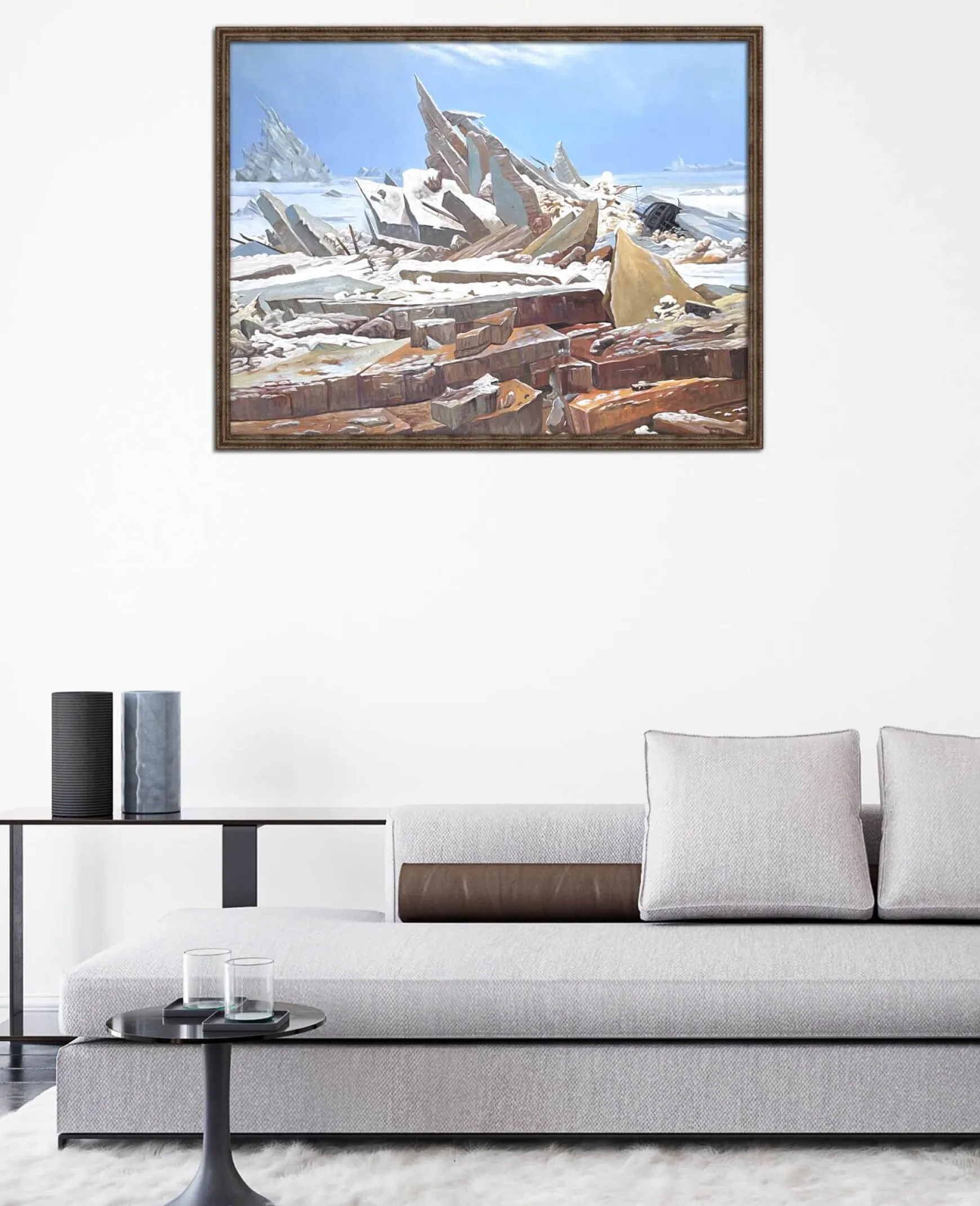 Caspar David Friedrich aime à peindre la nature dans toute sa magnificence mais ce tableau romantique en souligne le côté dangereux et implacable. Cette mer de glace déchaînée, découpée en imposants blocs pointus et saillants, démontre une puissance féroce et inflexible. L’œil s’attarde sur la beauté des couleurs et sur les détails du paysage, finement rehaussés par des touches de lumière, oubliant presque ce bateau malchanceux, dont le naufrage a créé ce somptueux tumulte. Friedrich est un passionné de la représentation épiques des paysages, que nous voyons aussi dans Le Voyageur contemplant une mer de nuages et Le Watzmann.
