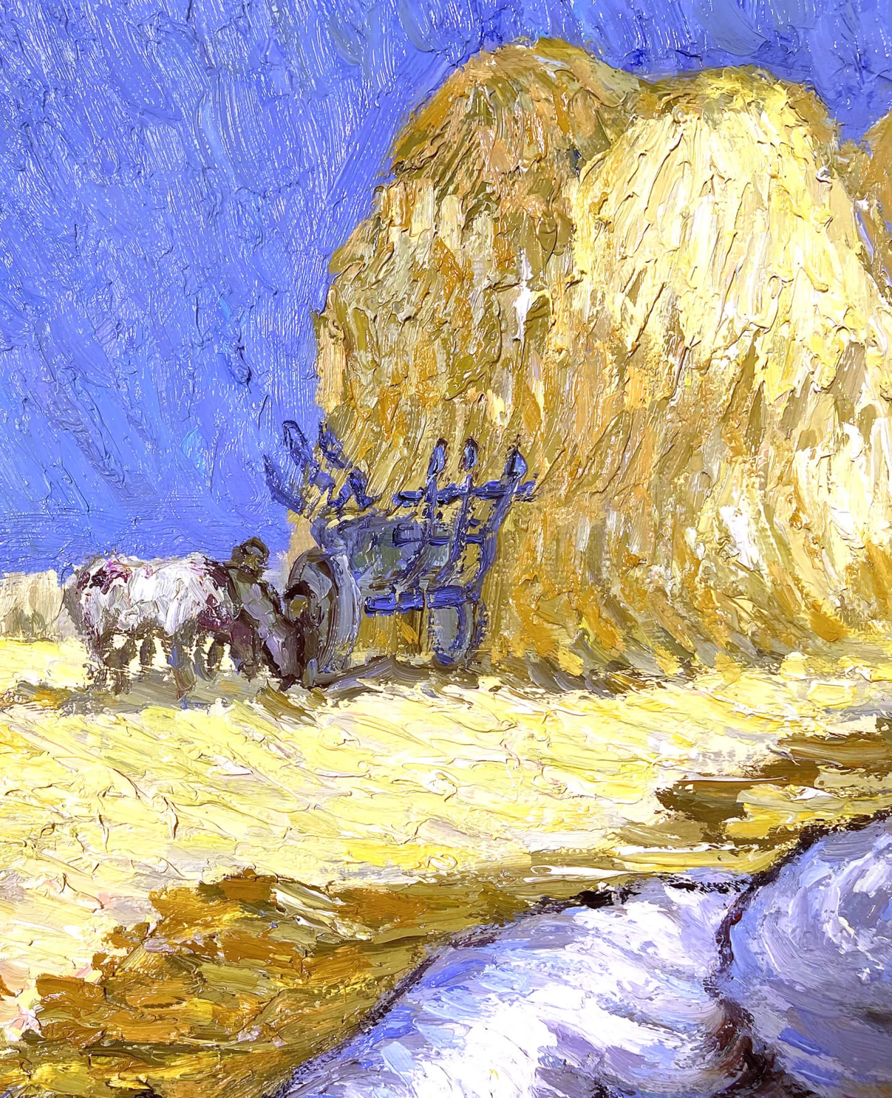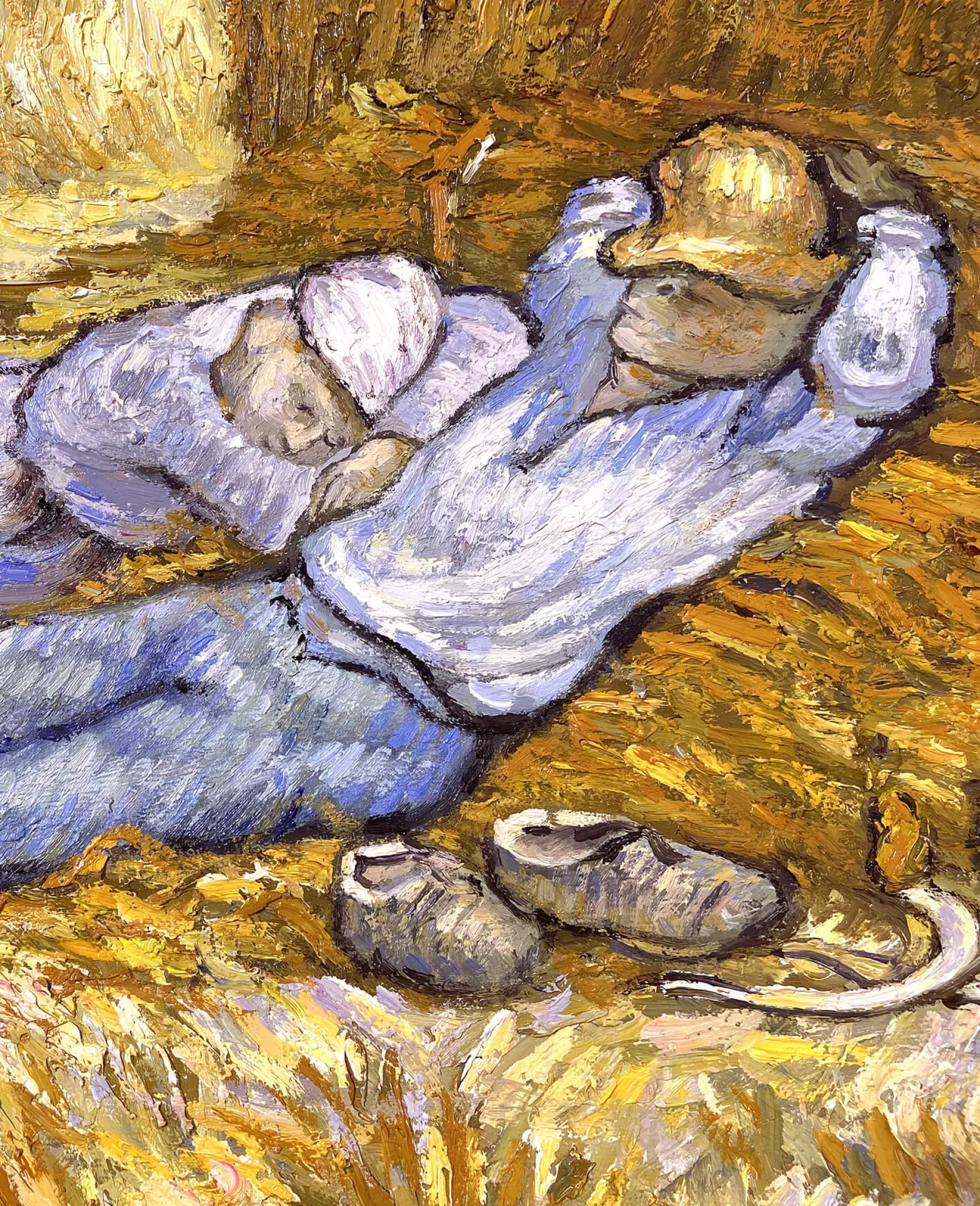 La composition est reprise d’un dessin de l’artiste Jean-François Millet. Cette retranscription personnelle et apaisante de Vincent Van Gogh se fait essentiellement par une construction chromatique fondée sur le contraste des couleurs qui permet de retrouver l’intensité constante émanant de ses œuvres. Couleurs que nous retrouvons souvent dans les tableaux de l’artiste, tels que Champs de blé aux Corbeaux et Champ de blé derrière l’hospice Saint-Paul avec un faucheur.