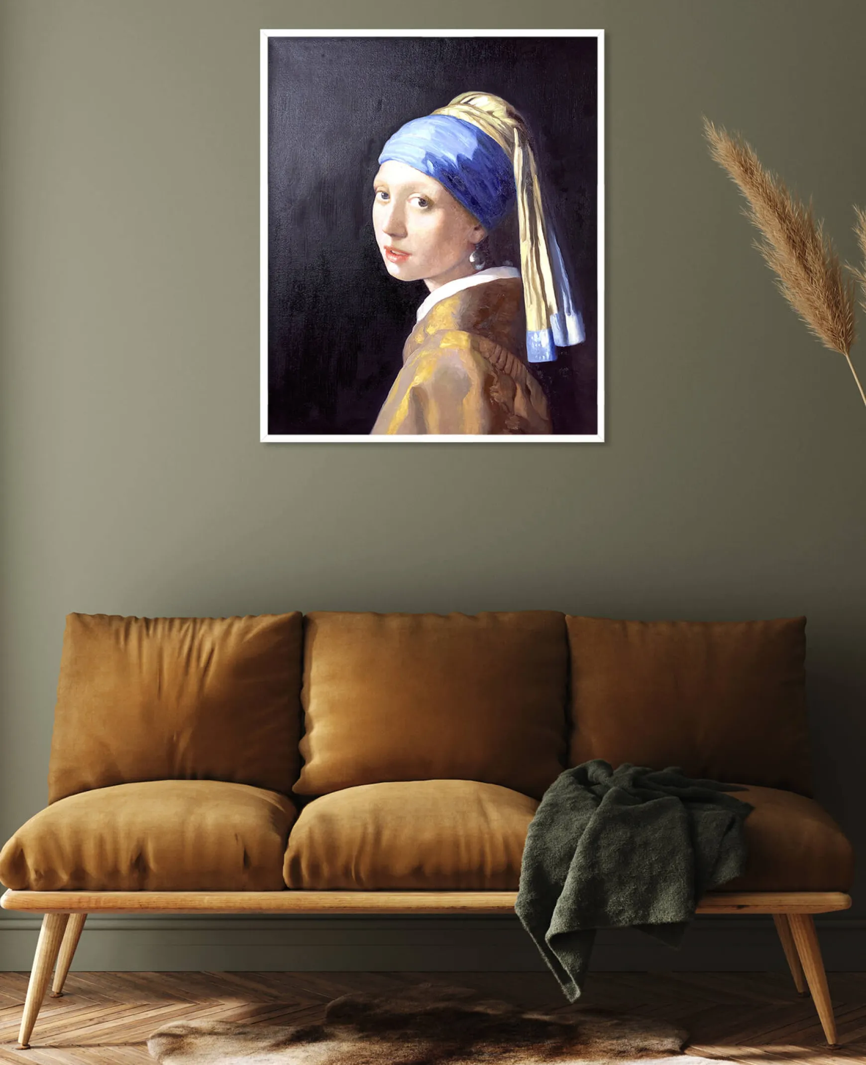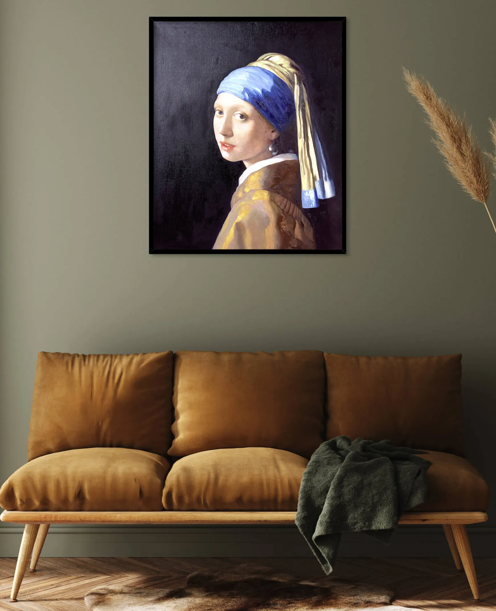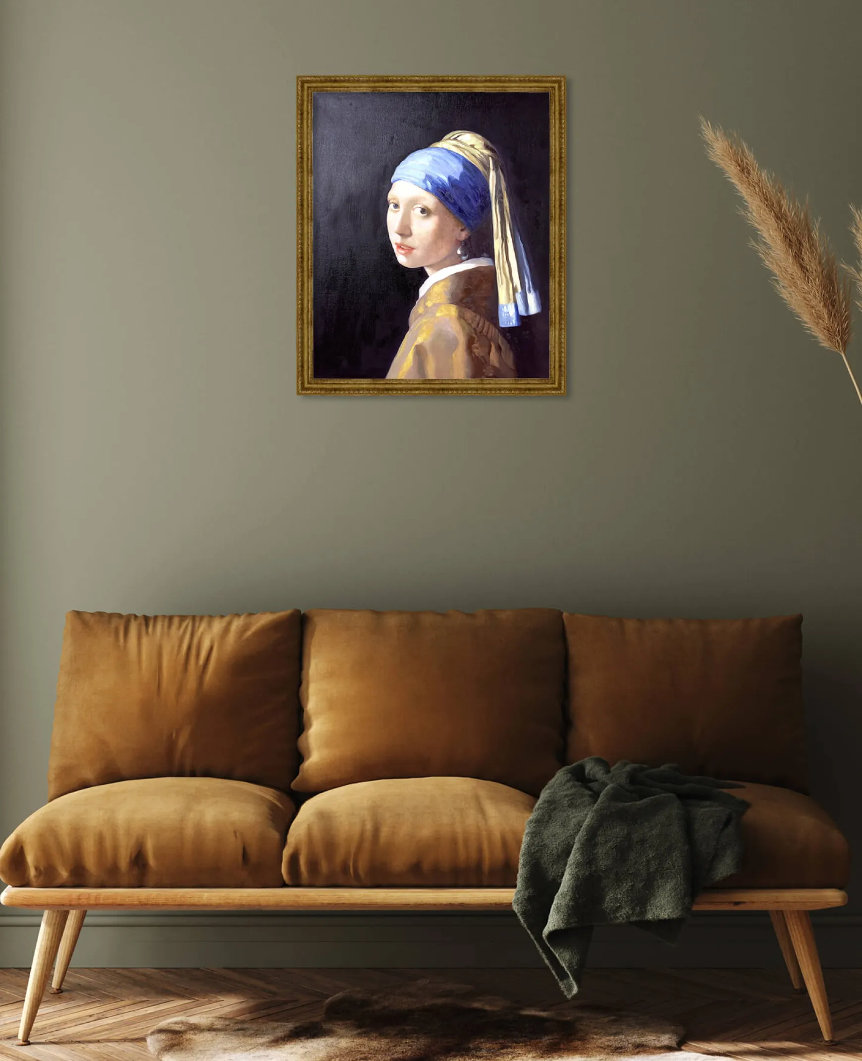 On comprend aisément pourquoi cette image irrésistible est devenue l’œuvre la plus admirée de Johannes Vermeer. Il capture l’attention du spectateur par des effets de lumière délicatement perlés et par le regard insistant du modèle, supposé être Maria, la fille aînée de l’artiste. Le traitement de l’arrière-plan de l’œuvre contraste avec celui, clair, riche et coloré, que Vermeer propose habituellement dans ses portraits. Ce choix contribue à faire éclater les deux couleurs de prédilection de Vermeer: le bleu outremer du turban et le jaune citron du tissu qui le surmonte. Avec la Laitière, il s’agit d’une des œuvres les plus connues de l’artiste.
