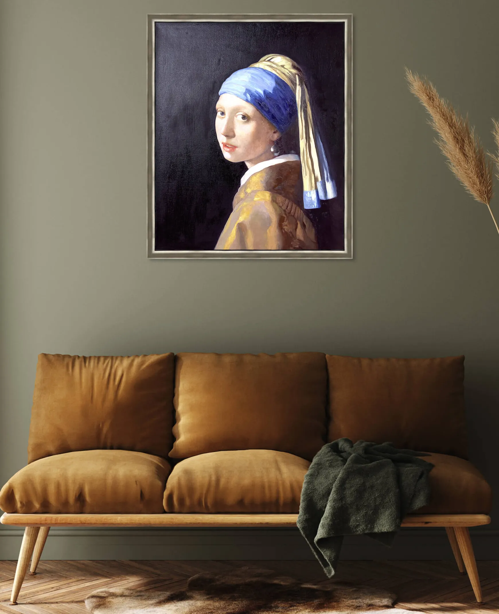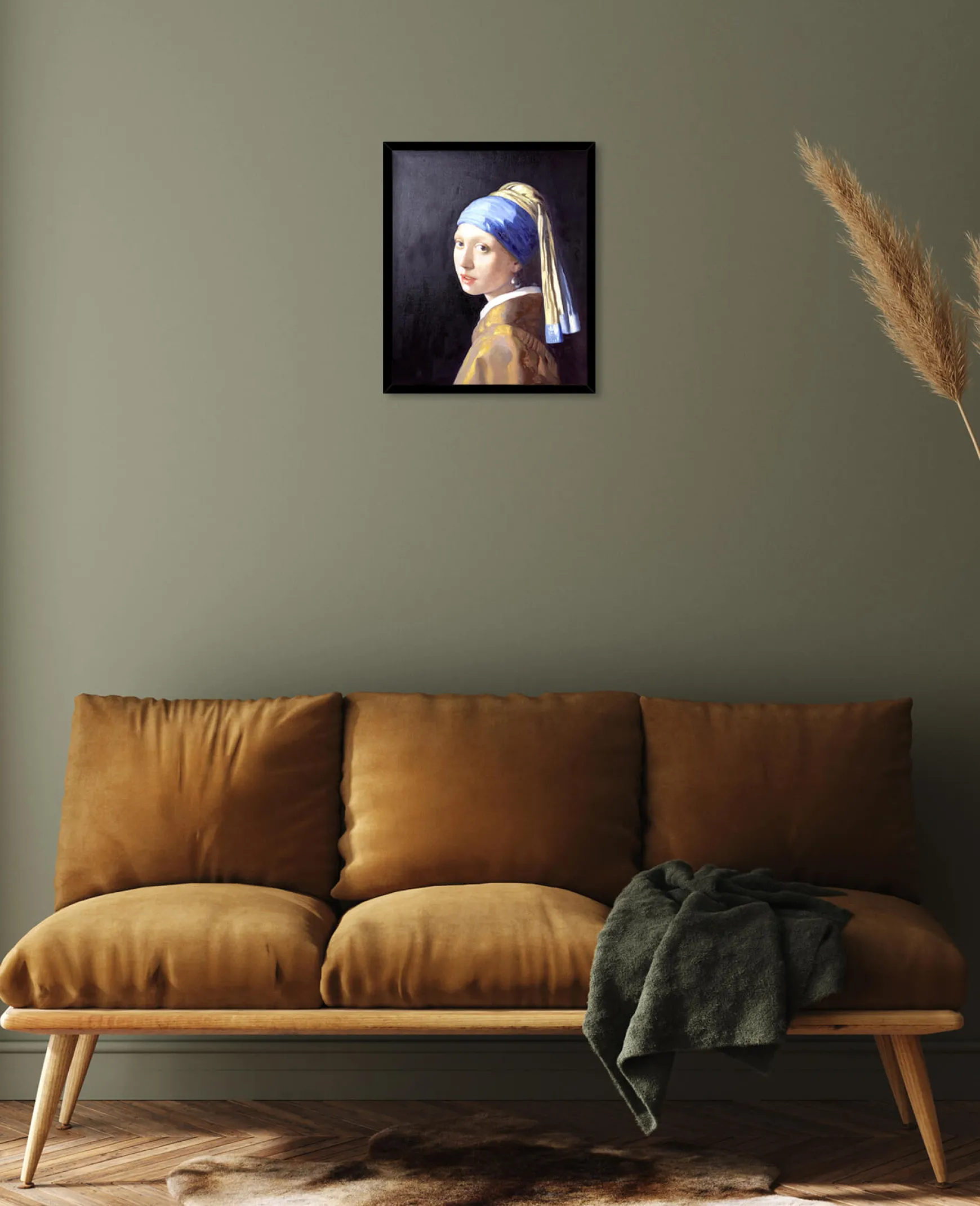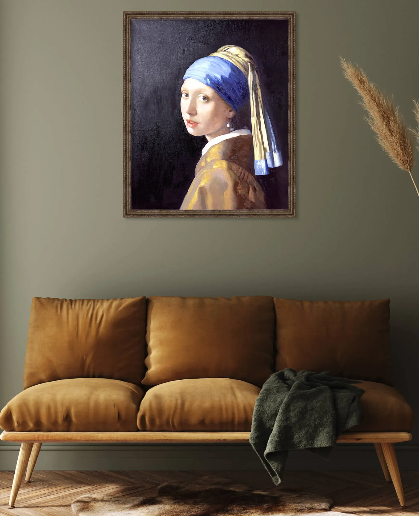 On comprend aisément pourquoi cette image irrésistible est devenue l’œuvre la plus admirée de Johannes Vermeer. Il capture l’attention du spectateur par des effets de lumière délicatement perlés et par le regard insistant du modèle, supposé être Maria, la fille aînée de l’artiste. Le traitement de l’arrière-plan de l’œuvre contraste avec celui, clair, riche et coloré, que Vermeer propose habituellement dans ses portraits. Ce choix contribue à faire éclater les deux couleurs de prédilection de Vermeer: le bleu outremer du turban et le jaune citron du tissu qui le surmonte. Avec la Laitière, il s’agit d’une des œuvres les plus connues de l’artiste.